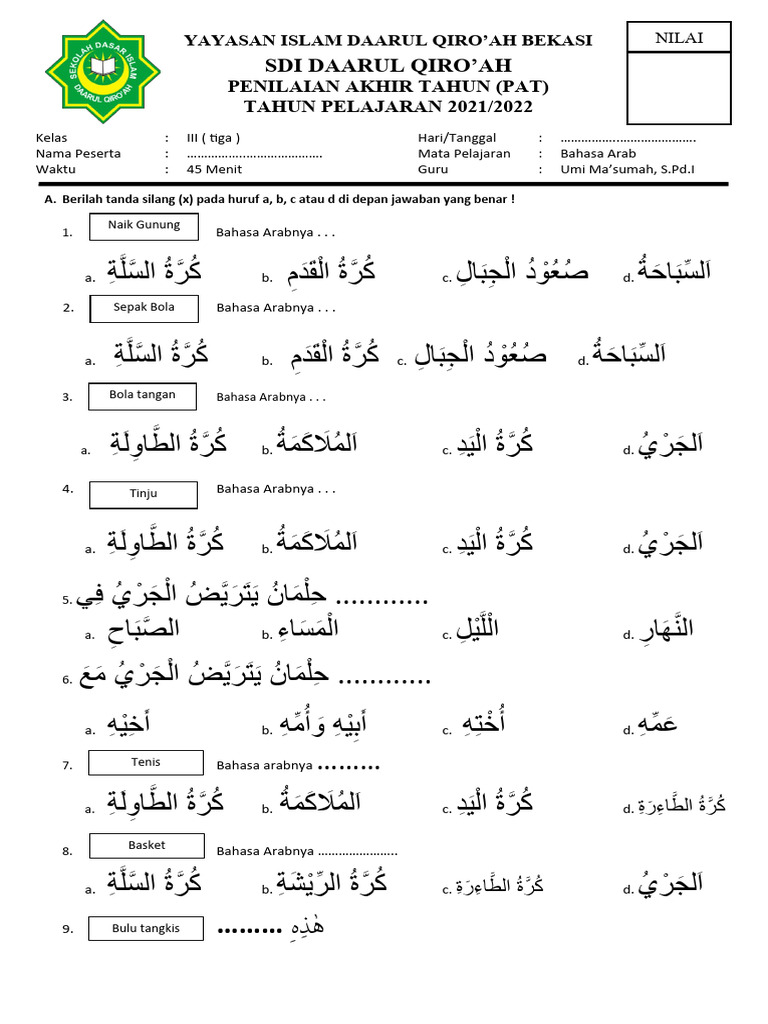 Bahasa Arab, dengan kekayaan sejarah, sastra, dan makna religiusnya, merupakan mata pelajaran yang semakin penting dalam kurikulum pendidikan di Indonesia. Bagi siswa kelas 3 Sekolah Dasar (SD) atau Madrasah Ibtidaiyah (MI), semester kedua menjadi periode krusial untuk mengkonsolidasikan pemahaman mereka terhadap dasar-dasar Bahasa Arab yang telah diajarkan. Ulangan umum semester 2 menjadi tolok ukur penting untuk mengevaluasi sejauh mana siswa telah menyerap materi, mulai dari kosakata dasar, struktur kalimat sederhana, hingga kemampuan membaca dan menulis.